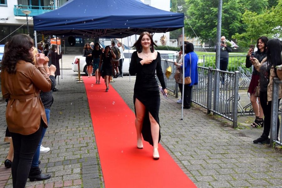 Er was een limousine die de leerlingen steeds per groepje voor de deur van de school ‘afleverde’ en eenmaal uitgestapt lag de rode loper klaar, plus een erehaag van alle eigen docenten. Applaus steeg daaruit op toen de leerlingen als ware sterren passeerden.